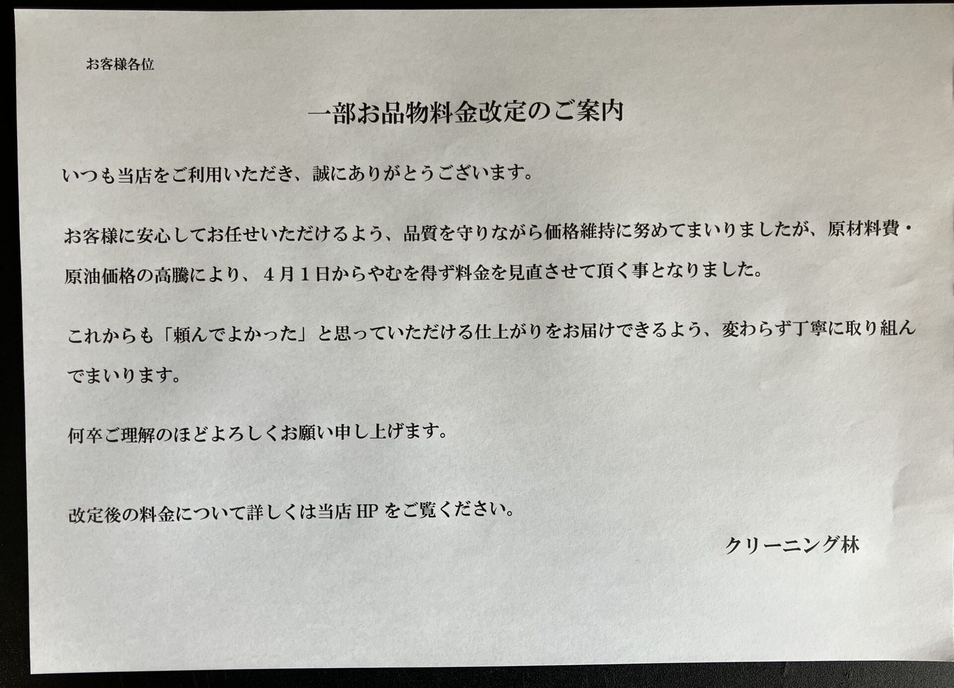 一部お品物料金改定のお知らせ クリーニング林のニ代目 2026年3月1日 いつも当店をご利用いただき、誠にありがとうございます。 お客様に安心してお任せいただけるよう、品質を守りながら価格維持に努めてまいりましたが、原材料費・原油価格等の高騰により、4月1日からやむを得ず料金を見直させて頂く事となりました。 これからも「頼んでよかった」と思っていただける仕上がりをお届けできるよう、変わらず丁寧に取り組んでまいります。 何卒ご理解のほどよろしくお願い申し上げます。 >改定後料金について詳しくはこちらをご覧ください。
