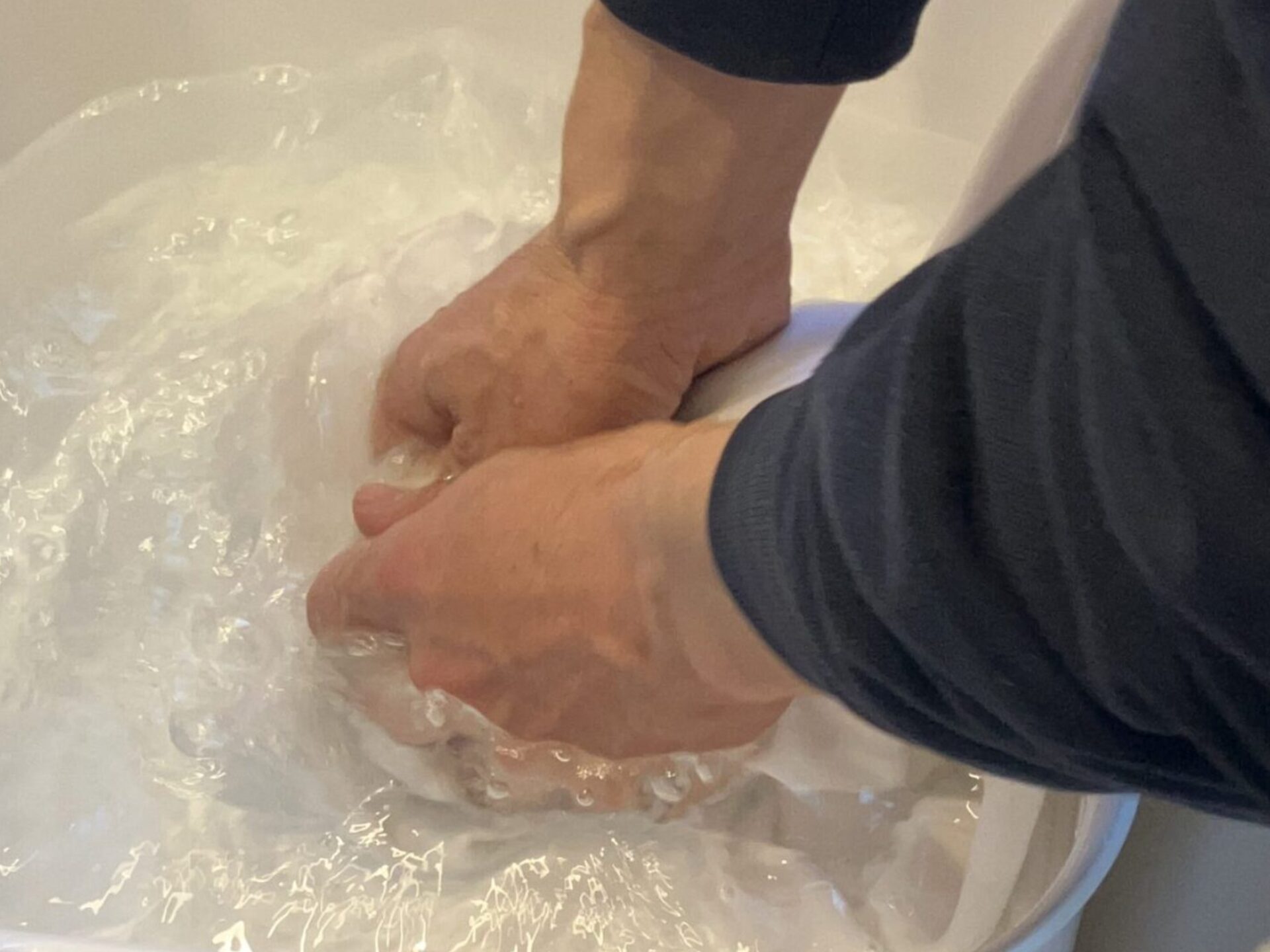 モミ洗い後はお湯を変えよく濯ぎます。