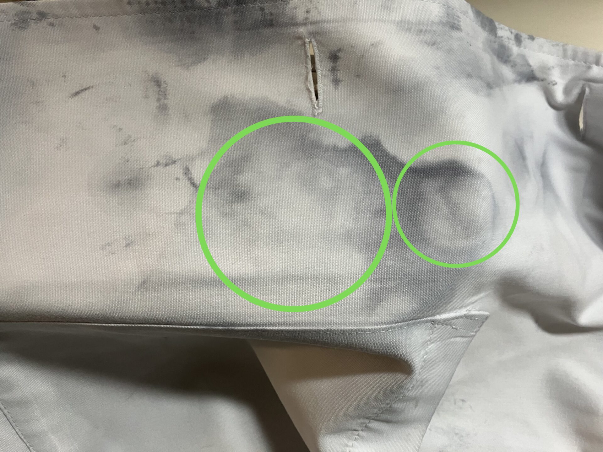 いわゆる「輪ジミ」というやつです。中心部分のシミが抜けても溶かしきれなかったインクが円状にシミとして残っちゃうんですね。