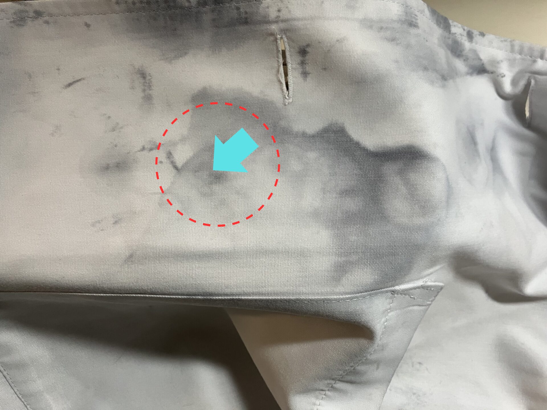 めげずに水色の矢印部分をシミ抜きしてみるわけですが、おそらく当然のように赤い丸状に輪ジミが発生します。その輪ジミをシミ抜きするとまた新たなうすい輪ジミが発生します(^^;)